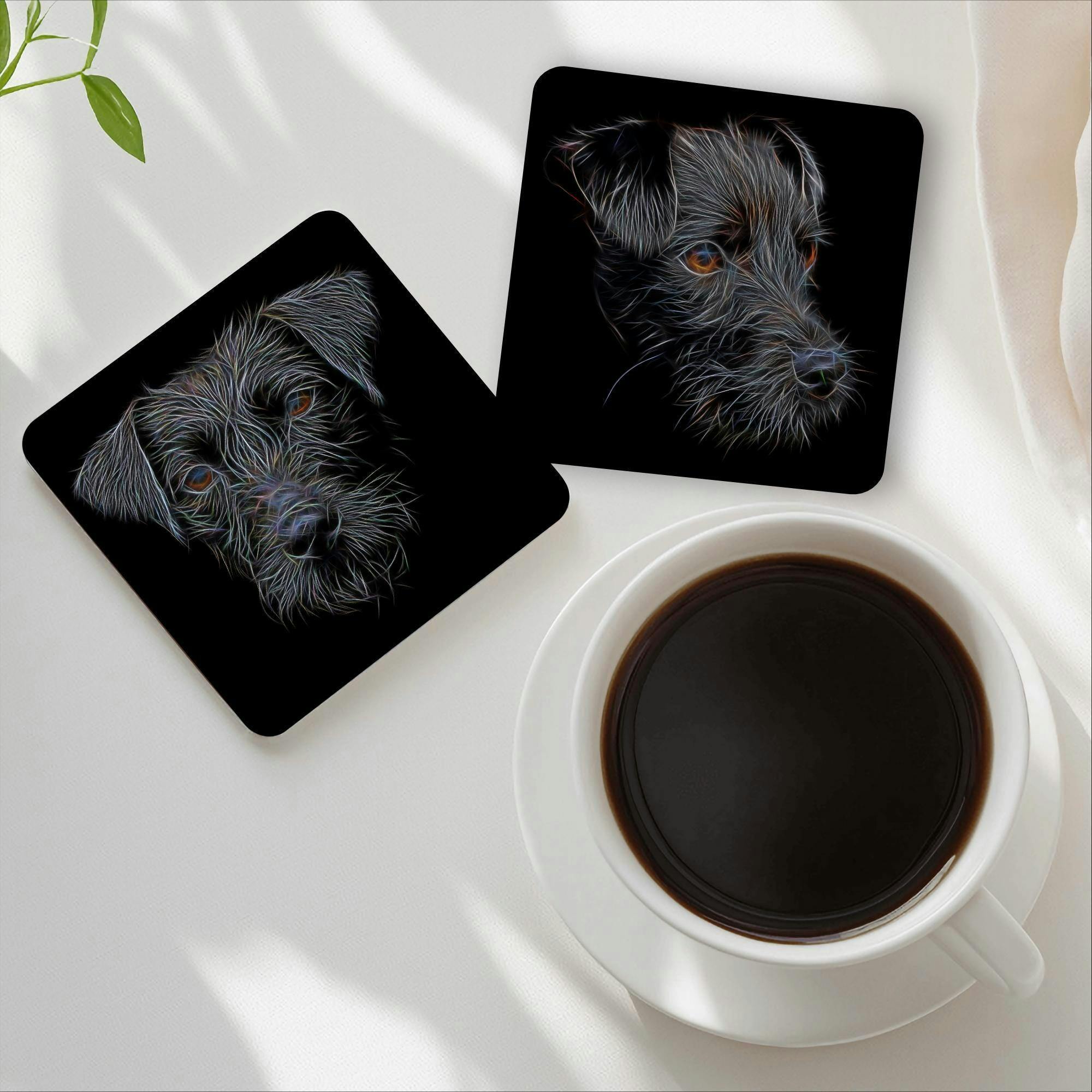 Black Patterdale Terrier Coasters, Set of 2, with Stunning Fractal Art Design.